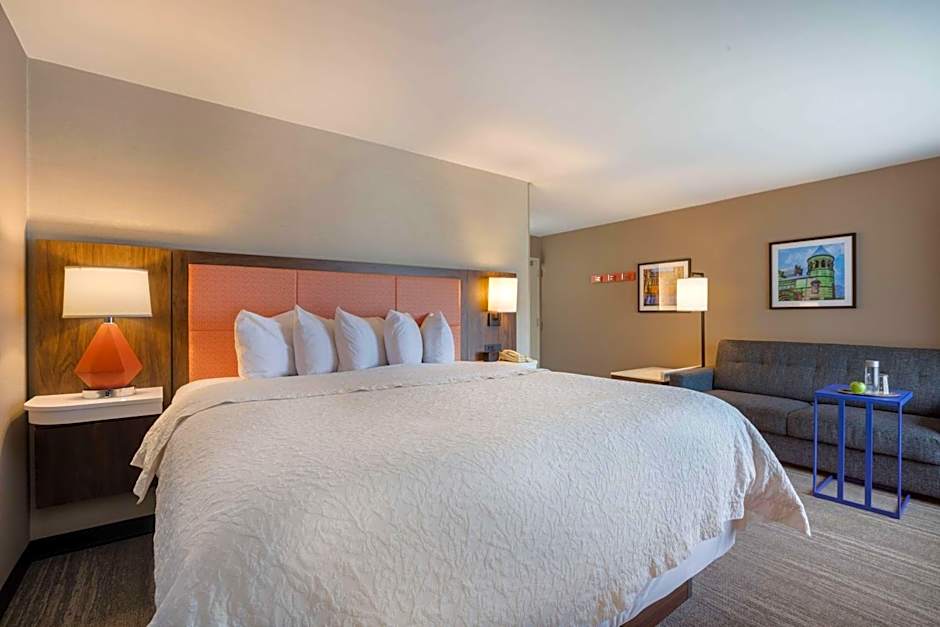 Pull-down bed, 46-inch HD TV, work desk, microwave, refrigerator, coffeemaker, free WiFi Enjoy a restful stay in this comfortable room with a king-sized clean and fresh Hampton bed® plus a pull-down queen bed, an easy chair and a 46-inch TV with HD channels. This room also features a large work desk, a microwave, mini-refrigerator and a coffeemaker. Free WiFi access will help you to stay connected when on the road. The bathroom contains plush towels and a shower featuring a curved shower rod for added space and light.